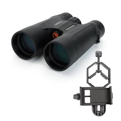 Celestron’s Outland X 10X50 binocular is fully loaded with advanced features essential for field use—all at a budget-friendly price. This versatile binocular can meet needs of every outdoor enthusiast, from birders and hunters to sports fans and travelers. The 10x magnification works great for long-distance viewing and the 50mm objective lenses provide increased light-gathering abilities for use in low light conditions. Capturing photos and video through the binocular is easy with the Celestron Smartphone Adapter. Whether you’re snapping an Instagram-worthy image of the Moon or sharing your latest wildlife sightings, this smartphone adapter installs in seconds by simply clamping over the top of the eyepiece. Tightening knobs securely lock your phone in place. Note that some large and/or excessively bulky phone cases (including folio-style cases) may need to be removed for your phone to fit in the adapter.