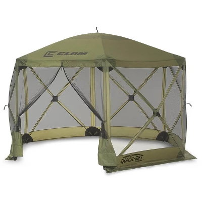 Rain or shine, experience nature with comfort in your CLAM Quick Set Escape Portable Outdoor Gazebo Canopy Shelter.Comes with a canopy shelter, 4 wind and sun panels, 6 deluxe tent stakes, tie-down ropes, and a carry bag for portability. Ideal for camping, picnics, and sporting events, this outdoor gazebo keeps the elements from ruining your day. The no-see-um mesh screen and extra wide skirt keep the bugs out, and it is spacious enough to fit a picnic table inside, so you can enjoy your meal in peace.Assembly-free and easily set up in just 45 seconds. When your stay is over, the canopy shelter can be easily stored in its convenient oversized carry bag. For added protection against wind, rain, and sun, attach the wind panels to your screen tent. These wind panels are compatible with all green CLAM Quick-Set canopies (CLAM tent is not included in the package).When unwanted weather shows up, add the 4 included panels for additional protection and keep the elements from ruining your day. Made from 150-denier Oxford fabric, they deter wind, rain, and bright sunlight so you can keep enjoying the outdoors in comfort. These weather panels are easy to install with elastic and hook and loop touch fastener straps allowing you to quickly attach the panels to your canopy tent.Embrace outdoor comfort with enhanced protection from elements with CLAM Quick Set Escape Portable Outdoor Gazebo Canopy Shelter.