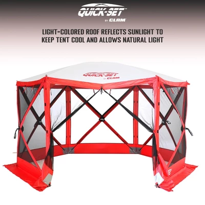 The QuickSet Escape Sport Outdoor Camping Canopy Shelter Tent was designed for outdoor sports enthusiasts. Featuring reinforced pole pockets that provide a durable shelter to be used on hard surfaces at sporting events and tailgating, this tent is built for a party. The 94-square foot pop-up canopy lets you support your favorite sports team in rain or shine because you aren’t just a fair-weather fan. This 6-sided outdoor tent accommodates up to 8 people, or use the space to fit a standard size picnic table. Equipped with a pop-up design, this gazebo tent only takes 45 seconds and 1 person to set up at a tailgate sporting event, or corporate event, or even farmer’s markets. No assembly is required. When your stay is over, the Quick-Set Escape can be easily stored in its convenient oversized carry bag. Hub to hub, this tent measures 140 inches wide, 140 inches long, and measures 7.5-foot at center height. Set-up size measures 11.5-foot across. With 4 different color combinations, fans are able to pick the color of their favorite sports team! The Sport has all the key benefits of a QuickSet – protection from rain, sun, and bugs with a quick 45-second set-up.