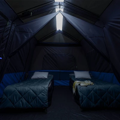 - WHAT’S IN THE BAG Includes tent with pre-attached poles, rainfly with attached guylines, room divider, battery compartment (4D batteries not included), tent stakes, and carry bag.