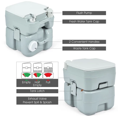 This portable toilet camping potty is specially designed for indoor and outdoor activities like camping, hiking, travelling, boating. It’s an ideal choice for you to answer nature’s call in emergency. Featuring powerful piston pump flush system and two large capacity tanks, this porta potty can fully flush your feces with less frequency of water refilling and waste tank emptying. Loose the side latch, you can disconnect the fresh water tank from waste water tank for easy carry and clean. And this design also makes storage more convenient. The exhaust valve plays an important role in daily usage and waste emptying to avoid splashing. Made of premium HDPE, the portable potty is durable for multiple and frequent travel usage.