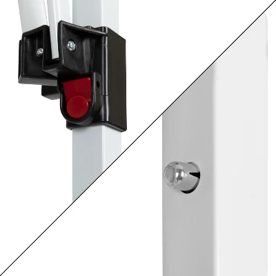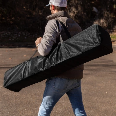 Portable shelters are an excellent way to provide shade during outdoor events and this black all-weather 10′ x 10′ pop up canopy tent will help keep you out of the elements so you can enjoy your time with family and friends. The weather resistant polyester top has reinforced corners to prevent ripping or tearing and is UV coated to resist fading from the sun’s rays. Simply unfold the fabric top, attach to the upper frame with the hook and loop fasteners, extend the bottom legs and pull open for instant protection. Strength and durability abound in this instant canopy. The white powder coated steel frame is rust and corrosion resistant and locks in place with a “pinch free” locking mechanism. The height adjustable frame takes you from the backyard to the beach and everywhere in between. This canopy pop up tent folds up when not in use and has its own bag for easy storage. This quick shade canopy includes the frame, canopy top and stabilizing ground stakes. Assembly takes less than 10 minutes and does not require tools. Take this portable shade canopy on camping trips, tailgating, the kids soccer games or for get togethers on your patio or in the yard. This party canopy tent will look great season after season.