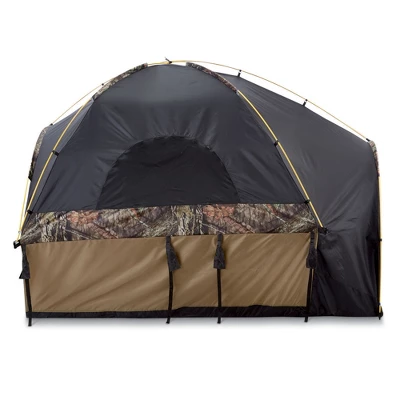 Redefine what “truck bed” means to you with the Guide Gear Premium Truck Tent. This large, comfortable tent provides a sleek, cool, and comfortable place to sleep while lifting you up off the ground in the back of your truck. Constructed from durable aluminum poles and built to last, the camping tent is perfect for short excursions to the woods or long hunting trips. 8 tie-downs secure the tent snugly to the truck, and its 64-inch peak, wide door, and cab-access window allow plenty of movement to and from your camping space. This full-size model fits truck beds of 79 to 81 inches with the tailgate down.A large, bathtub floor keeps the interior from getting wet, meaning you can spread out your gear without worrying about water or debris. Perfect for all your camping and hunting needs, there is no need to look any further. The Guide Gear Premium Truck Tent is sure to get you up off the ground so you can have the safe, dry, and restful sleep you deserve.