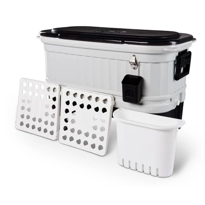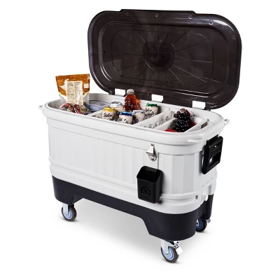 Inspired by the outdoor beer chests found at a traditional Texas ice house, the Igloo® Party Bar™ is the ultimate cooler for keeping your party going from day into night. This 125 quart ice chest is the ultimate party cooler for tailgating, outdoor events and more. Featuring a built-in bottle opener with cap catch bin, removable drink dividers and bottle caddy, and an easily removable lid; the Party Bar provides all the essentials to entertain. For added convenience, the Party Bar’s base with locking casters allows you to move your food and drink from the pantry to the party and is easily removed for use as an ice chest or for storage. Style, function, and easy clean up—the Igloo® Party Bar™ is top notch!
