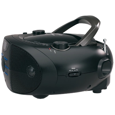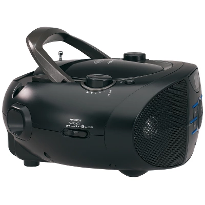 The JENSEN® CD-560 is a stylish portable stereo boombox with Bluetooth® connectivity, a top loading CD player that supports CD-R/RW discs, and AM/FM radio. Connect your Apple®, Android™, or Digital Media Player device via Bluetooth and wirelessly stream music or any other audio content to the speakers from up to 33 feet away. The unit also features a blue LED track display for the CD details and front mounted blue ambient lighting. The CD player controls include Skip/Search, Forward, Back, and Repeat buttons, along with Programmable Memory. This great, portable compact disc player has a foldable carrying handle, telescopic antenna, and AUX line-in jack for connecting your iPod®, MP3, or other digital audio player. Requires 120V AC/60Hz or uses eight (8) “C” batteries to operate.