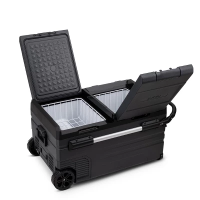 - Retractable handle and off-road wheels make it easy to use this 12v/24v car fridge anywhere.