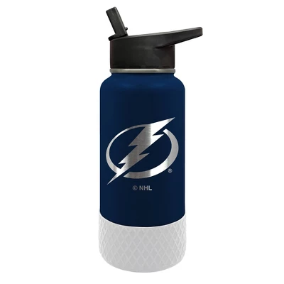 The Thirst Hydration Water Bottle is 32 fluid ounces. This water bottle is vacuum insulated and made with kitchen grade stainless steel. Powder coated in team color with an alt team color silicone grip, this water bottle features laser etched graphics and includes a flip top, spill proof lid. A great way to show your team spirit while on the go or at the gym.
