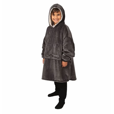 Wrap your little one in total comfort with The Comfy Original Jr. Microfiber Wearable Child-Sized Blanket Hoodie in Charcoal.This ultra-snug blanket hoodie is a light, soft, dreamlike wearable blanket made pint-sized for kids. With a single layer of luscious microfiber, your kiddo will enjoy long-term comfort. Perfect for indoor playtime, energetic games, or a cozy time on the couch, this oversized hoodie will have your kid living The Comfy life. The high-low hem means the sweatshirt is also longer in the back for extra oversized comfort and style. A large plush hood keeps their head cozy and can even double as a pillow.With the Marsupial pocket, featuring a unique shape, they can keep their hands warm and store all their essentials including stuffies, snacks, phones, and more. The ribbed cuffs on the oversized sleeves keep the sleeves up and out of the way when needed, or they can easily pull their arms in to cover themself completely. Easy to clean by tossing in the washer and dryer, this hoodie measures 29 inches from top to bottom in the front.Keep your kiddo comfortable and cozy with the Original Jr. Wearable Child-Sized Blanket Hoodie from The Comfy.